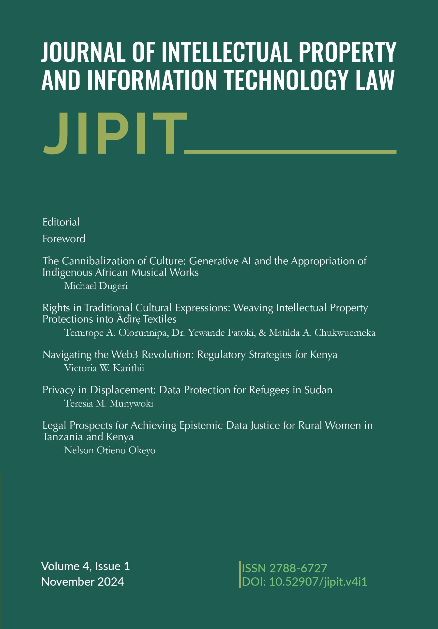 This Fourth Edition of JIPIT explores the intersection of law, technology, and culture in the Global South. Featuring articles addressing generative AI’s impact on African heritage, data protection for refugees, Web3 regulation, and equitable frameworks for rural women in agriculture. DOI: https://doi.org/10.52907/jipit.v4i1 Published: 2024-11-28